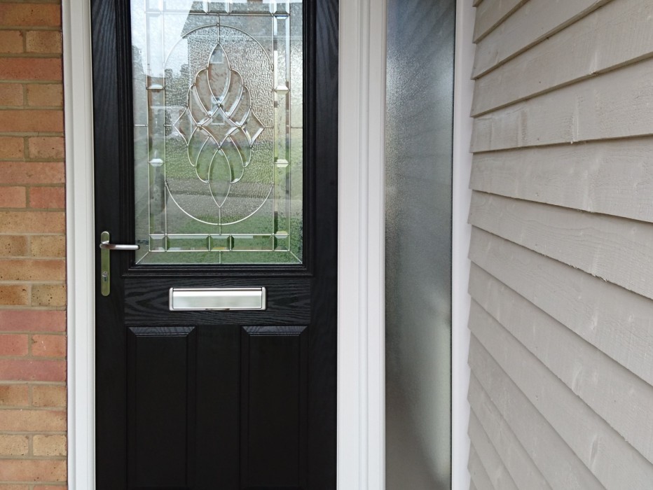 COMPOSITE DOOR IN BLACK BEVELLED TOP GLASS PANEL FITTED IN WELLINGBOROUGH,NORTHANTS
