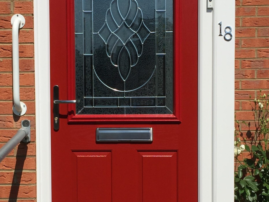 Red Composite Door recently fitted by The Window Shop in Wellingborough. Bevelled Glass design and Chrome Furniture.